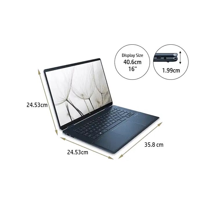 [4] Laptops manufactured with ocean-bound plastic material in product speaker enclosures and keyboard keycaps contain post-consumer recycled plastic. Percent of recycled materials contained in each component varies by product. Outer Boxes and Fiber Cushions with 100% sustainably sourced and recyclable packaging.   HP Spectre x360 2-in-1 Laptop 16-f1007TX
