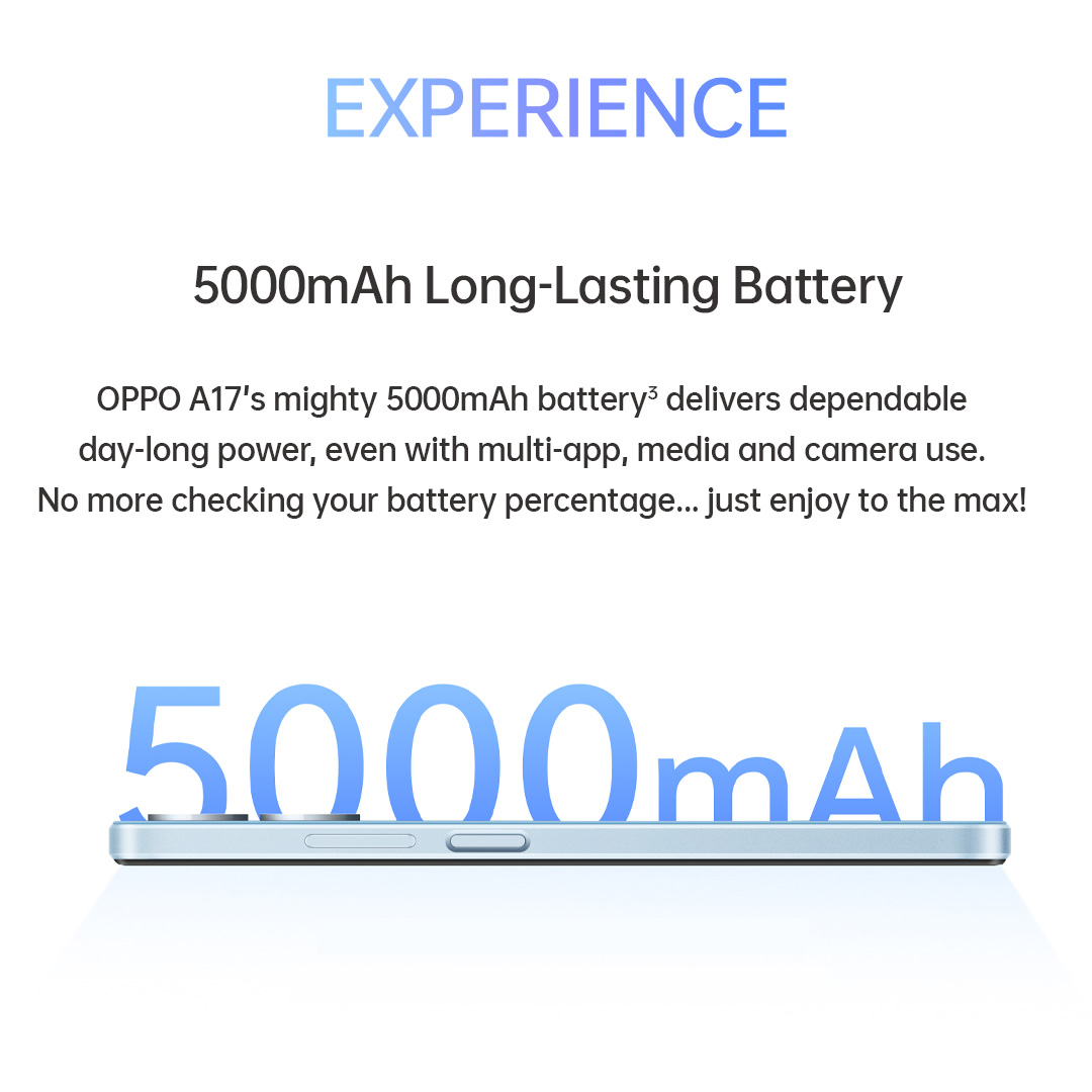 The OPPO A17 is equipped with 5000mAh long-lasting batteries combined with smart charging and