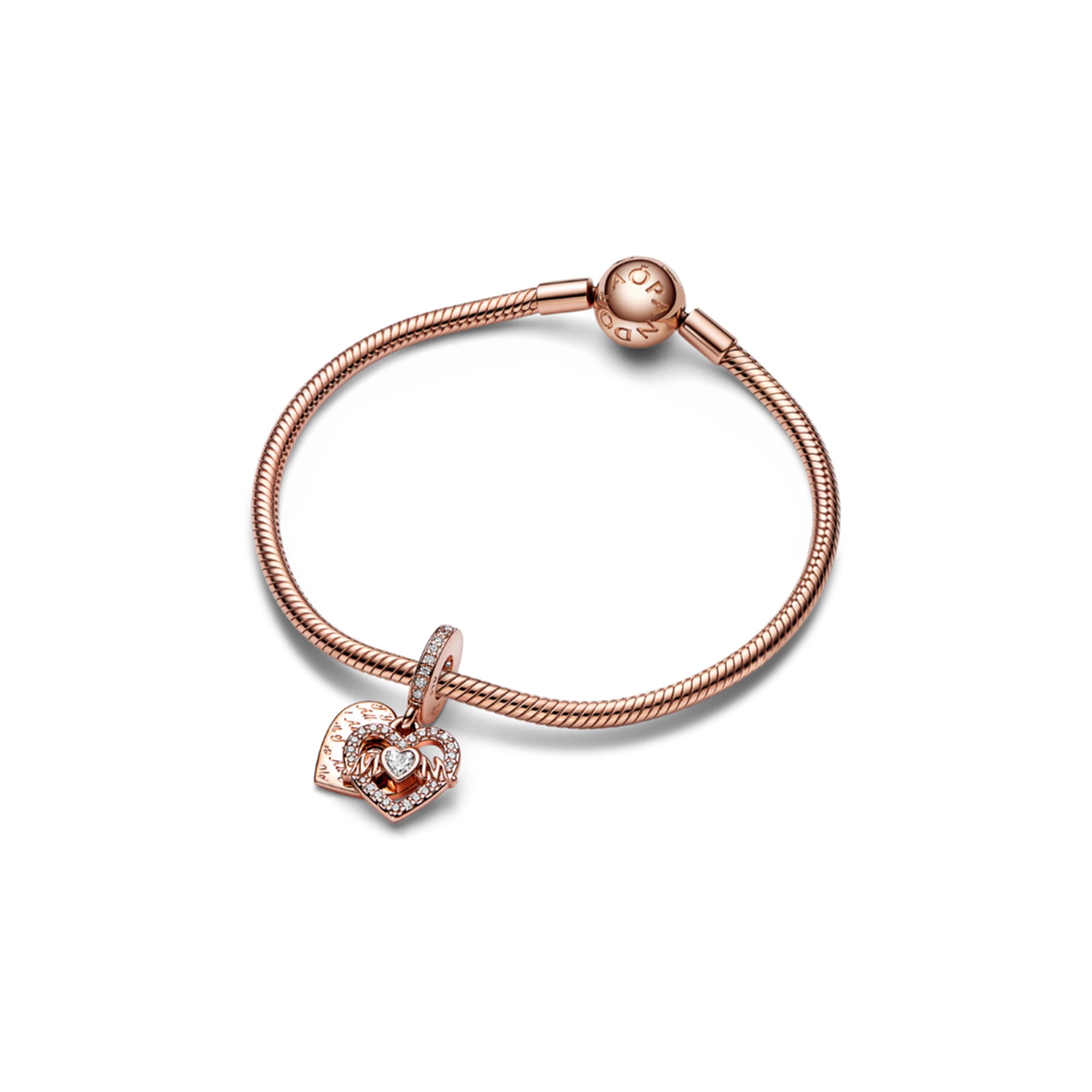 Celebrate the bond of love you share with the Heart & Mum Dangle Charm. This heart-shaped double dangle charm is finished in warm 14k rose gold plating with sparkling pavé on the bail and outlining the front dangle. The front dangle has the word "M♥M" in openwork script with a heart-shaped stone forming the central letter. The back dangle is engraved with the message "All of me loves all of you" in a repeated pattern. A heartfelt jewellery gift for the mother figure in your life.